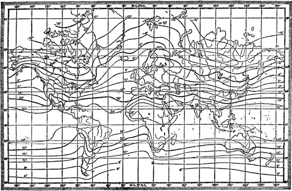 The stratosphere has been explored in widely scattered parts of the earth, and information concerning it is daily accumulating. Although it extends over the whole world, the altitude at which it begins is by no means uniform. The altitude is greater in summer than in winter; it varies with the barometric pressure at the earth’s surface; and it is decidedly greater over the equator than over the poles. The last fact leads to an interesting paradox. Since over the equatorial regions the temperature keeps on falling with ascent to a greater height than in other latitudes, it is here that the lowest temperatures in the atmosphere are found. A sounding balloon sent up from Batavia, Java, in November, 1913, recorded 113° below zero Fahr., the lowest air temperature ever observed. In middle latitudes the temperature of the stratosphere averages something like 68° below zero Fahr.