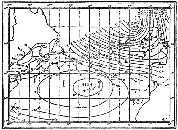 Scientific balloon ascents are no novelty. Some were made in the eighteenth century, and many famous ones in the nineteenth, including those of Biot, Gay-Lussac, Glaisher, Tissandier, and other daring savants. The “record” height for such personal ascents was attained in 1901, when Berson and Süring rose to 35,400 feet above Berlin. Kites were19 sent up for meteorological purposes even before Benjamin Franklin’s immortal experiment in 1752. Modern aerological methods have, however, little in common with these pioneer undertakings. Existing types of box kites, pilot balloons, sounding balloons, and self-registering meteorological apparatus for upper-air research were developed in the latter part of the nineteenth century, but their use did not begin to bulk large in meteorology until about the beginning of the present century. The epoch-making event in these undertakings was the discovery of the isothermal layer.