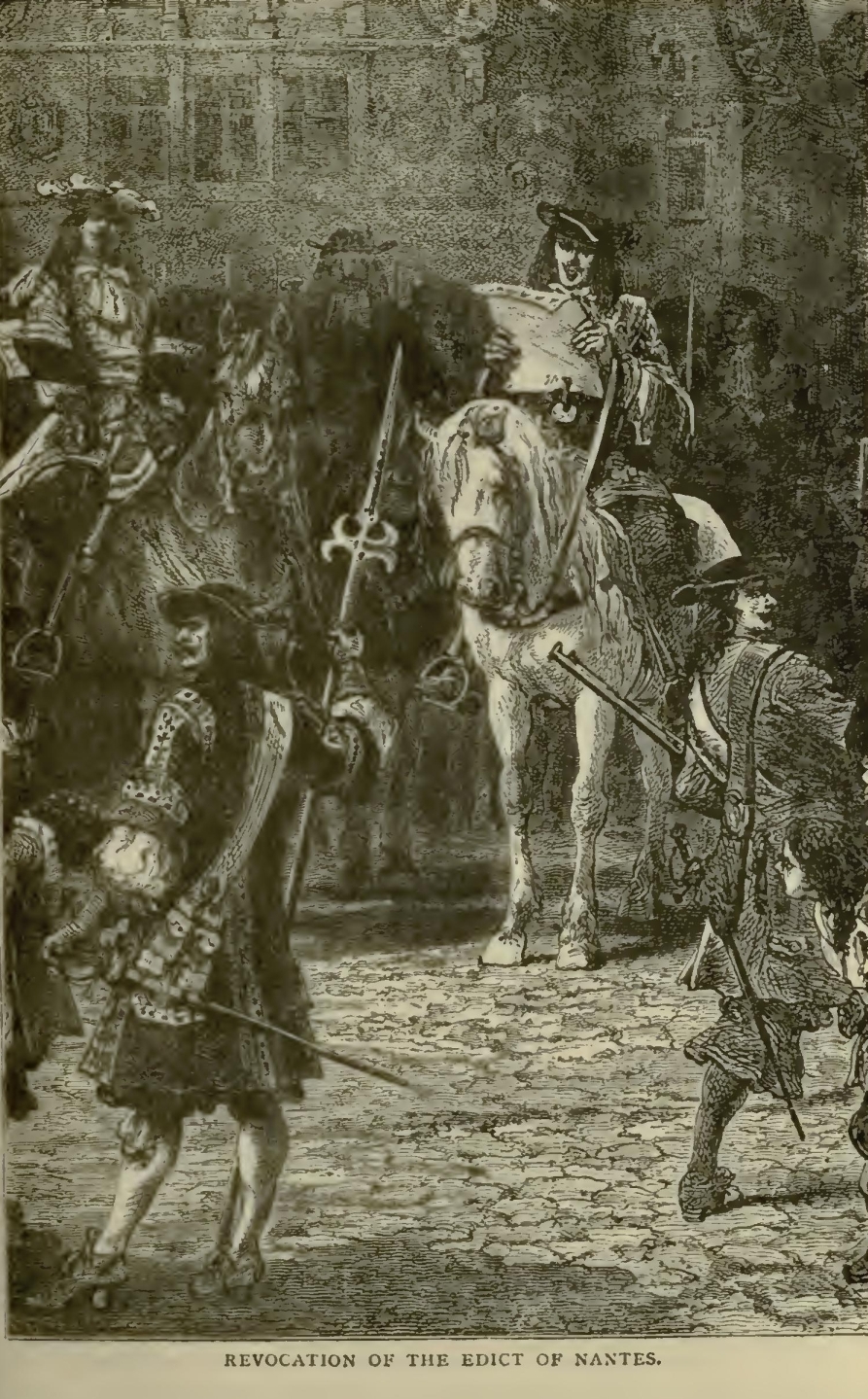 When the Edict of Nantes was revoked by Louis XIV., of which mention has been made in a previous reign, persecutions that equalled the never-to-be-forgotten St. Bartholomew, followed, and being spread over a longer period, affected a larger number of victims. This Edict had permitted to Protestants the free observance of their religion so long that when it was repealed it was a cruel blow, though perhaps a triumph to Roman Catholics. Those faithful adherents to Protestantism who refused to become converts were executed or imprisoned; but thousands escaped and fled, leaving their property to be confiscated to the crown, while they sought refuge, strangers in a strange land, with poverty staring them in the face. Those were times when horrors unspeakable were of daily occurrence. Armed bodies of dragoons went from town to town in France, barbarously butchering the terror-stricken men, women, and children, who had failed to confess and receive the sacrament according to the mode prescribed by the king; while thousands hastened at the point of the sword to do so, pretending, in order to escape massacre, that 016they had suddenly awakened to the error of their former ways.