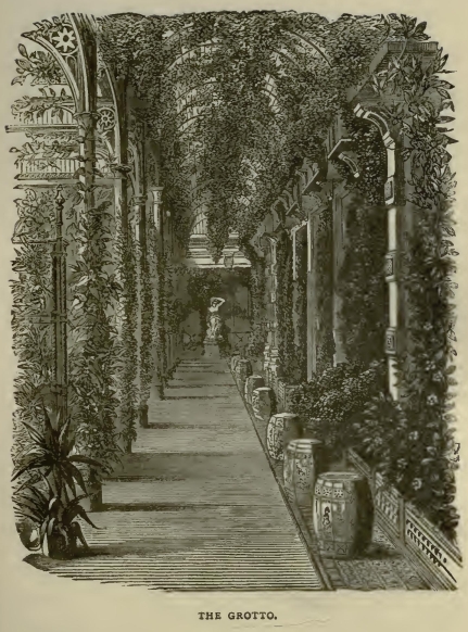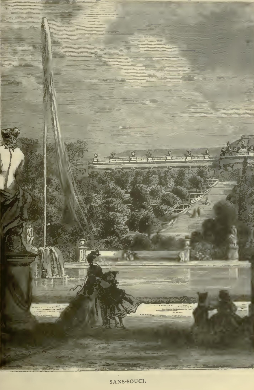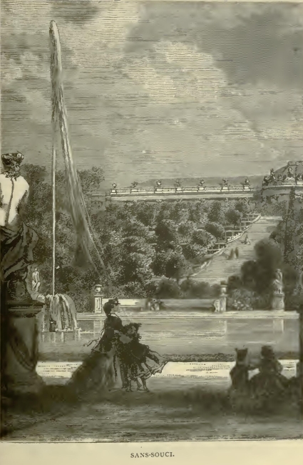 "Another five or six minutes brought us to the Potsdam station, where were a band and a guard of honor of gigantic guardsmen with pointed caps, and all the princes and princesses. After a few minutes we got into open carriages and drove up to Babelsburg. The castle was beautifully lit up. The Princess of Prussia and Vicky took us to our rooms, which are very comfortable. It was eleven. Many well-known faces appeared among the servants, and I felt quite at home. We supped with our children, and the prince and princess, and then went up to bed, wishing our dear child, as of old, good-night." The next morning was passed quietly at the castle, and in the evening the royal party drove through Potsdam to the beautiful gardens of Sans-Souci, and visited the palace built by Frederick the Great, in which he lived and died. The queen was charmed with the splendid orange trees at Sans-Souci, some of them two hundred years old, all festooned with vines, reaching from one to another.