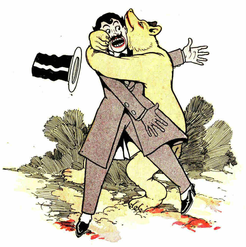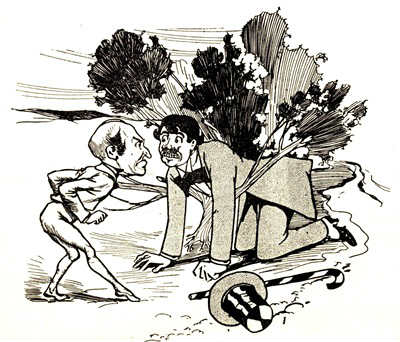 When the afternoon was half over he entered again, running as if fiends were at his heels. In the center of the room he paused, slapped his forehead despairingly with both palms, and said in a wailing voice: