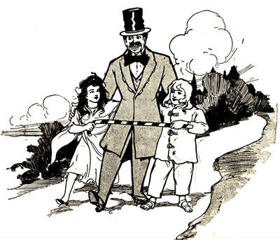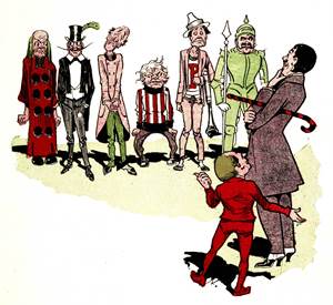 The man appeared to be dressed in excellent fashion. Monsieur made him a collar and shirt-front of white bread dough, which looked very beautiful in contrast to the brown gingerbread-dough of his clothes. Then with a lump of dough, carefully kneaded, he formed the man's necktie, making a very artistic bow indeed. A waistcoat of fashionable cut was next added. The buttons on the man's coat were white lozenges, and to represent shoes the baker mixed his dough with licorice, until the shoes seemed as black and shiny as if freshly polished.