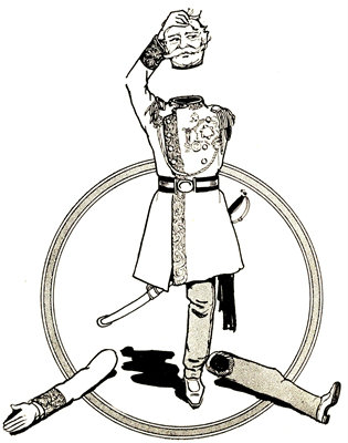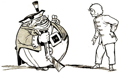The soldier seemed surprised when the Cherub emerged from the deserted castle, but he took off his tall hat and bowed politely. His uniform was of blue cloth, with brass buttons.