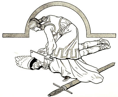 When all had been made ready and John was seated in the throne, Chick went to the west door of the castle hall and threw it open, and at the same time Para Bruin opened wide the east door. Then, together, they cried out to the people: