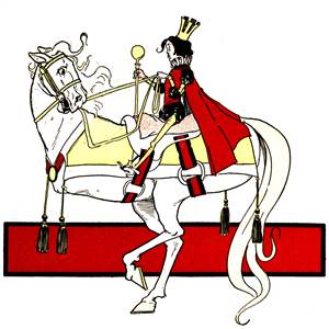 Thereupon the child led John Dough to the King's attiring-room, and hunted in the closets until a fine ermine robe and a crown and scepter were discovered. The crown was a little tarnished [Pg 310]from lack of use, but the jewels in it still sparkled brightly; so the bear set it upon John's gingerbread head and put the scepter in his right hand. Chick folded the ermine robe around him in such a way that his missing left hand was not noticed, and then they led the gingerbread man to the great hall and placed him in the royal throne.