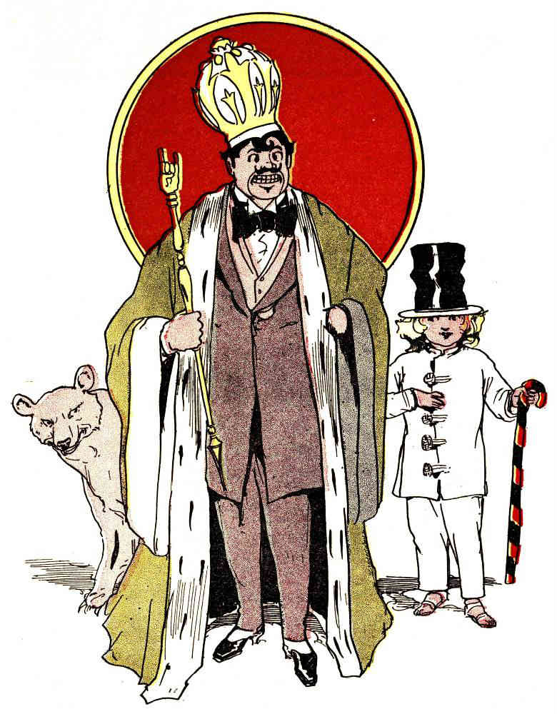 He might have looked more dignified had not his nose been badly chipped and his left glass eye so loose in its socket that it rolled every way but the right way; however, the robe concealed the fact that his shirt-front was soiled and cracked, and that several lozenge-buttons had broken off during his recent adventures. But kingly robes and a kingly crown cover many defects, and when Para Bruin and the Cherub stood back and took a critical look at their friend they felt quite proud of his regal appearance.