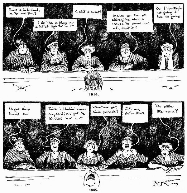 You may think that you have had enough of War Sketches, but you will be glad to see the historic “Gadgets” again, and perhaps even now “1914-1918” will give you a lump in the throat with your smile, and make you somehow a little more proud. It is so very much England. But, taking the drawings as a whole, I should say that the charm of their humour lies in the fact that they make the very jokes which we should have made for ourselves, if only we had realized that they were jokes. When Mr. Bateman gives us his brilliant life-study of the man who breathed on the glass in the British Museum, we realize that this is an inspiration far outside our range. “However did he think of it?” we say to ourselves in awe. When Mr. Morrow draws us “a little supper-party at the Borgias,” we have to admit sadly that the comedy of a supper-party at the Borgias would never have occurred to us. But when Fougasse describes to us his feelings in the presence of the Wedding Detective, or the conversation of the Club Bore in the library, then we beam upon him delightedly. Why, it’s absolutely true! We’ve noticed it ourselves a hundred times! As we were saying to Jones only yesterday—Alas we flatter ourselves. We saw the pebbles lying there, day after day, and there, for us, they would still be lying. But a humorist picks them up and holds them this way and that. The light shines upon them. See! They are precious stones.