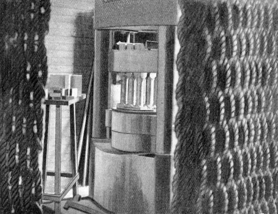 This pulping of the gun cotton not only enables one to more305 completely purify it, but it also renders it possible to mold it into convenient forms and to compress it so as to greatly increase its efficiency in use. For this purpose the pulp is suspended in water and pumped to a molding press, where, under a hydraulic pressure of one hundred pounds to the square inch, it is molded into cylinders or prisms about three inches in diameter and five inches and a half high, and these are compressed to two inches in height by a final press exerting a pressure of about sixty-eight hundred pounds to the square inch. As this is regarded as a somewhat hazardous operation, the press is surrounded by a mantlet woven from stout rope to protect the workmen from flying pieces of metal in case of an accident. The operation is analogous to that employed in powder-making, where the gunpowder has been pressed in a great variety of forms and into single grains weighing several pounds apiece.