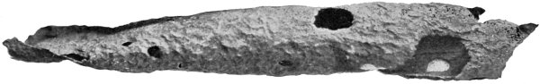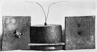 Mercury fulminate is made by dissolving mercury in nitric acid and pouring the solution thus produced into alcohol, when a violent reaction takes place and the fulminate is deposited as a crystalline gray powder. This powder is loaded in copper cases and, after drying, it is primed with dry-mealed gun cotton, the mouth of the case being closed with a sulphur-glass plug, through which pass two copper leading wires joined by a bridge of platinum-iridium wire, two one-thousandths of an inch in diameter,307 which becomes heated to incandescence when an electric current is sent through it. This device is what is known as the naval detonator. Mercury fulminate is so employed because it is the most violent of all explosives in common use, and exerts a pressure of forty-eight thousand atmospheres when fired in contact. Although the naval detonator contains but thirty-five grains of mercury fulminate, yet it will rupture stout iron and heavy tin torpedo cases when fired suspended in them, it will rend thick blocks of wood when placed in a hole and fired within them, and it will even pierce holes through plates of the finest wrought iron one-sixteenth inch in thickness if only the base of the detonator is in contact with the plate, and this has been used as a test of their efficiency. Its force is markedly shown by firing one in a stout iron cylinder filled with water and closed tightly, when the cylinder is blown into a shredded sphere. When used to detonate gun cotton, either when confined or in the open, the detonator is placed in the hole which has been molded in the center of the gun cotton disk or block, so that it shall be in close contact with the gun cotton. I have found that perfectly dry compressed gun cotton is detonated by 2.83 grains of mercury fulminate; but as a torpedo attack is necessarily in the nature of a forlorn hope and should be provided with every possible provision against failure, and since if the detonator fails the attack fails, the naval detonator is supplied with thirty-five grains, so as to give a large coefficient of assurance.