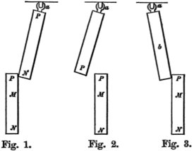 In Fig. 1 the lower outline, M, represents a magnet fixed in position, and the upper bar represents another magnet arranged to swing freely around the pivot a. A magnet, as is generally known, will arrange itself in a north-to-south position if suspended from its center, like a scale beam, and allowed to swing freely, and the same end will always point toward the north. On this account the ends of a magnet are called its poles, and the one that will point toward the north is designated the north pole, while the other one is the south pole. The terms north and south poles were applied to magnets centuries ago, but at the present time the ends are more commonly designated as positive and negative. In Fig. 1 it will be noticed that the stationary magnet has its positive end upward, and this attracts the negative end of the swinging magnet. If the order of the poles is reversed, so that the positive of the swinging magnet will come opposite the positive of the stationary one, then there will be a repulsive action instead of an attraction, as is shown in Fig. 2. If the two negative ends were placed opposite, the effect would be the same. From this we see that to obtain an attraction we must place the magnets so that opposite poles come together, and that by reversing the order we obtain a repulsive action.