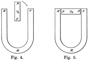 If the swinging magnet is replaced by a bar of iron, as is shown in Fig. 3, there will be an attraction, no matter what end of the magnet may be uppermost, thus showing that either end of a magnet will attract a bar of iron. The explanation of these different actions is that when two magnets are brought into proximity to each other each one exerts its force without any regard to the other, and if the two are set to act together they will attract one another, but if set to act in opposition they will repel. When one of the bars is not a magnet, but simply a piece of iron or steel,318 this bar, having no attractive or repulsive force of its own, can only obey the attractive action of the other, which is the only one that exerts a force.