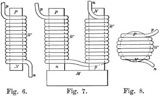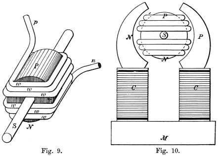 In Fig. 6 W represents a coil of wire provided with a cotton covering, so that there may be no actual contact between the adjoining convolutions. If the ends p n of this coil are connected with a source of electric energy, an electric current will flow through it, and if a bar, as indicated by N P, of iron or steel is placed within the coil it will become magnetized. If the bar is320 made of steel and is hardened it will retain the magnetism, and become what is called a permanent magnet; such a magnet, in fact, as we have considered in all the previous figures. If the bar is made of iron it will not retain the magnetism, but will only be a magnet as long as the electric current flows through the coil W. A magnet of the latter type is called an electro-magnet. If the iron is of poor quality—that is, from an electrical standpoint—it will require an appreciable time to lose its magnetism, but if it is soft and high grade, electrically considered, it will lose its magnetism instantly, or nearly so. If we take two bars of soft iron and arrange them side by side, as in Fig. 7, and wind coils around them as indicated each one will become magnetized when the ends p n of the coils are connected with an electric circuit. If the lower ends of the two bars are joined by a piece, as shown at M, we will have a horseshoe electro-magnet. If we take a round disk of iron, as in Fig. 8, and wind a coil around it, it will also become a magnet when an electric current traverses the coil. Thus it will be seen that it makes little difference what the shape of the iron may be, providing it is surrounded by a coil of wire and an electric current is passed through the latter. This being the case, it is evident that either of the processes explained in connection with Figs. 4 and 5 can be made available for the production of a continuous rotation by the aid of electro-magnets. Suppose we make a drum, as shown in Fig. 9, and wind a wire coil around it in the direction indicated, then when a current passes through the wire the drum will be magnetized, with poles at top and bottom. If the electric current passes through the wire from end p to end n the drum will be magnetized positively at the top and negatively at the bottom, and if the direction of the current through the wire is reversed the polarity of the drum will be reversed. If we construct a horseshoe magnet of the shape shown in Fig. 10, and place within the circular opening between its ends the drum of Fig. 9, we will have a device that is capable of developing a continuous rotation, providing we have suitable means for reversing the direction of the electric current through the wire coil; and this machine constitutes an electric motor in its simplest form.