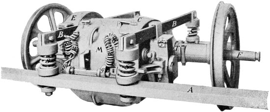A motor having a single coil of wire upon the armature, as in Fig. 10, would not give very satisfactory results, owing to the fact that the rotative force developed by it would not be uniform. Such motors are made in very small sizes, but never when a machine of any capacity is required. For large machines it is necessary to wind the armature with a number of coils, so that the rotating force may be uniform, and also so that the current may be reversed by the commutator without producing sparks so large as to destroy the device. When an armature is wound with a number of coils the direction of the current is reversed, by the commutator, in each coil as it reaches the point where its usefulness ends, and where, if it continued to flow in the same direction, it would act to hold the armature back. The effect of this reversal of the current in one coil after another is to maintain the polarity of the armature practically at the same point, so that the strongest pull is exerted between it and the field magnet poles at all times. To explain clearly the way in which the commutator reverses the current in one coil at a time it will be necessary to make use of a diagram illustrating what is called a ring armature. Such a diagram is shown in Fig. 11. The ring A is the armature core, and is made of iron; the wire coils are represented as consisting of one turn to each coil, and are marked w w w. The current enters the wire through the spring B, and passes out through C. As can be seen, the current from B can flow through the coils w w in both directions, thus dividing into two currents, each one of which will traverse one half of the wire wound upon the armature. The two half currents will meet at C. If the armature is rotated the springs B and C (which are called commutator brushes) will pass from one turn of the wire coil to another just back of it as the rotation progresses, and each time that contact is made with a new turn the direction of the current in the turn just ahead will be reversed. The current in the wire as a whole, however, will always be in the same direction—that is, in all the turns to the right of the two brushes; the current will flow toward the center of the shaft on the front side of the armature, and away from the shaft in all the turns on the left side. As the direction of the current on opposite sides of the brushes is always the same, the poles323 of the armature will remain under B and C, therefore the relation between the position of the poles of the armature and the field magnet will be the same substantially as that illustrated in Fig. 10, and, as a result, the force tending to produce rotation will at all times be the greatest possible for the strength of the current used and the size of the magnets.