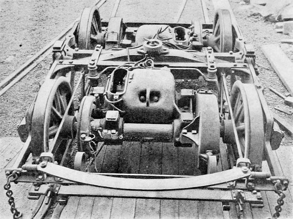 The position of the motors with reference to the truck and car wheels is very well shown in Fig. 20, and also the manner in which they are held in place. The covers of the openings through which access to the commutator brushes is obtained are removed from both motors, and in the forward one the top of the commutator and one of the brushes can be readily seen. The manner in which the motors are suspended from the truck is not the same in this figure as in those previously shown, but this is simply because the machines are not made by the same concern, and each manufacturer has his own design.
