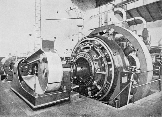 419 Electric generators for railway work are made in all sizes, from those only large enough to operate four or five cars to others capable of furnishing sufficient current for thirty or forty or even more. Small generators are made so as to be driven by a belt running over a pulley mounted on the end of the armature shaft, or they may be arranged to be connected to the end of a steam-engine shaft, and thus become what is called direct connected machines. Large generators are almost invariably of the latter type. A machine of this class is illustrated in Fig. 23. The driving engine is shown at E, the cylinder being in the background and the crank toward the front, the shaft being clearly seen at S, while F is the fly wheel. The generator is mounted directly upon the engine shaft, between the bearing at the crank end and the fly wheel. The large ring marked G is the field magnet ring, and at D D D the field coils are shown. These coils are equally spaced all the way around the circle. The commutator is marked C, and the commutator brushes are located at B B. The armature can not be seen very well, as it is covered by the brush holders and their supporting frames, but it is located within the ring G in the position designated by A. This machine is one of a number used to operate the roads of Troy, N. Y., and is of about one-thousand-horsepower capacity, which is enough to furnish all the current required to run sixty or seventy cars.