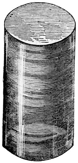 We returned to the real mouth of St. Michael’s Cave, which is entered by a wicket. The floor was somewhat muddy, and the roof and walls were wet. Our guide took off his coat, but we did not follow his example. We were soon in the midst of a natural temple, where tall columns sprang complete from floor to roof, while incipient columns were growing to meet each other, upwards and downwards. The water which trickles from the stalactite, after having in part yielded up its carbonate of lime, falls[459] upon the floor vertically underneath, and there builds the stalagmite. Consequently, the pillars grow from above and below simultaneously along the same vertical. It is easy to distinguish the stalagmitic from the stalactitic portion of the pillars. The former is always divided into short segments by protuberant rings, as if deposited periodically, while the latter presents a uniform surface. In some cases the points of inverted cones of stalactite rested on the centres of pillars of stalagmite. The process of solidification and the architecture were alike beautiful.