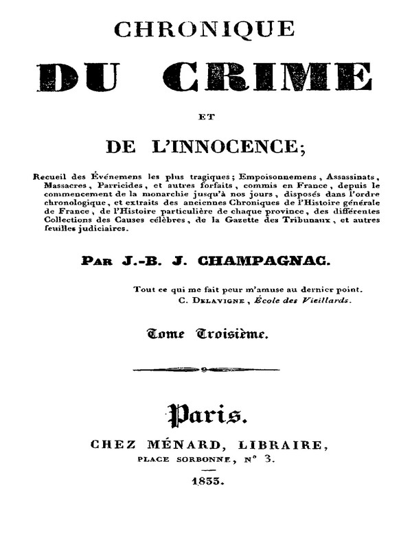 Recueil des Événemens les plus tragiques; Empoisonnemens, Assassinats, Massacres, Parricides, et autres forfaits, commis en France, depuis le commencement de la monarchie jusqu'à nos jours, disposés dans l'ordre chronologique, et extraits des anciennes Chroniques de l'Histoire générale de France, de l'Histoire particulière de chaque province, des différentes Collections des Causes célèbres, de la Gazette des Tribunaux, et autres feuilles judiciaires.