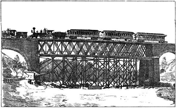 The danger from derailment and the fearful result which must follow in high bridges like this is sufficient argument for the addition of guards, or some other means to prevent trains from going off.