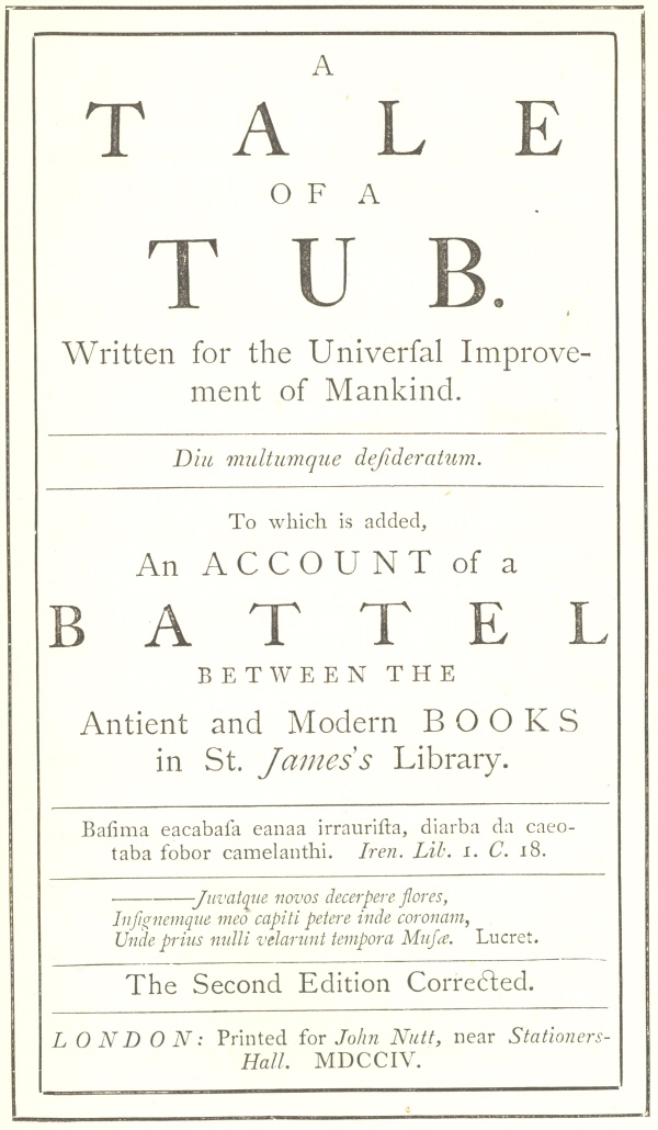 The wits of the present age being so very numerous and penetrating, it seems the grandees of Church and State begin to fall under horrible apprehensions lest these gentlemen, during the intervals of a long peace, should find leisure to pick holes in the weak sides of religion and government. To prevent which, there has been much thought employed of late upon certain projects for taking off the force and edge of those formidable inquirers from canvassing and reasoning upon such delicate points. They have at length fixed upon one, which will require some time as well as cost to perfect. Meanwhile, the danger hourly increasing, by new levies of wits, all appointed (as there is reason to fear) with pen, ink, and paper, which may at an hour’s warning be drawn out into pamphlets and other offensive weapons ready for immediate execution, it was judged of absolute necessity that some present expedient be thought on till the main design can be brought to maturity. To this end, at a grand committee, some days ago, this important discovery was made by a certain curious and refined observer, that seamen have a custom when they meet a Whale to fling him out an empty Tub, by way of amusement, to divert him from laying violent hands upon the Ship. This parable was immediately mythologised; the Whale was interpreted to be Hobbes’s “Leviathan,” which tosses and plays with all other schemes of religion and government, whereof a great many are hollow, and dry, and empty, and noisy, and wooden, and given to rotation. This is the Leviathan from whence the terrible wits of our age are said to borrow their weapons. The Ship in danger is easily understood to be its old antitype the commonwealth. But how to analyse the Tub was a matter of difficulty, when, after long inquiry and debate, the literal meaning was preserved, and it was decreed that, in order to prevent these Leviathans from tossing and sporting with the commonwealth, which of itself is too apt to fluctuate, they should be diverted from that game by “A Tale of a Tub.” And my genius being conceived to lie not unhappily that way, I had the honour done me to be engaged in the performance.