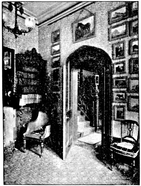 It is not necessary to say that the interior of Vernon Holme is in every way worthy of its owner. The land on which it stands was originally a hop ground, and Mr. Cooper tells with great gusto that whilst the people were picking the hops his men were getting the ground ready for the foundation of the house. The house was built from Mr. Cooper's own designs. The hall, of solid oak, is very fine and massive, and the carving about the ceiling and staircases exquisite. The bosses on the ceiling were cut from Nature's models of hops and wild flowers. The antlers over the doors were a present from Sir Edwin Landseer, and are reminiscences of deer shot by him in Scotland. The engravings comprise proofs after Sir Edwin and Tom Landseer, and Leslie's "Coronation of Queen Victoria."