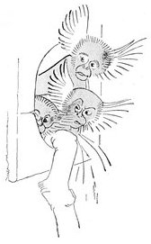 Of the big monkey-house, who remembers more than a nightmare of tails, paws, and chatterings? Here are monkeys with beards, monkeys with none, big monkeys, little monkeys, monkeys with blue faces, monkeys who would appear to have escaped into the grounds at some time and to have sat on freshly painted seats; all thieving from visitors and each other,[Pg 461] pulling tails, swinging, turning somersaults, with faces expressive of unutterable dolor and weariness of the world. The wizen, careworn face of the average monkey appeals to me as does that of the elderly and rheumatic circus-clown, when his paint has washed off. The monkey, I am convinced, is as sick of his regulation jokes as is the clown of his. But he has a comic reputation to keep up, and he does it, though every mechanical joke is a weariness and a sorrow to the flesh. "There is somebody's tail hanging from a perch," reflects the monkey, looking lugubriously across the cage. "I am a joker, and several human creatures are looking at me, and preparing to laugh; consequently, I must pull that tail, though I would prefer to stay where I am, especially as it belongs to a big monkey, who will do something unpleasant if he catches me." And with an inward groan he executes the time-honoured joke and bolts for his life. It is a sad affliction to be born a wag by virtue of species. There is one monkey here who for some weeks displayed a most astonishing reluctance to snatch things through the wires, and a total disinclination to assist or share in the thefts of his friends by "passing on" or dividing. For some time I supposed him to be a moral monkey strayed from a Sunday-school book, and afflicted with an uncomfortable virtue. But afterwards I found that his conscientiousness was wholly due to his having recently grabbed a cigar by the hot end, and imbibed thereby a suspicion of the temperature of everything. Beware especially, in this house, of the paws of Marie, the Barbary ape. She has a long reach, and quickness enough to catch a bullet shot Poole-fashion—softly. Only Jungbluth, her keeper, can venture on familiarities, and him she takes by the eyebrows, gently stroking and smoothing them.