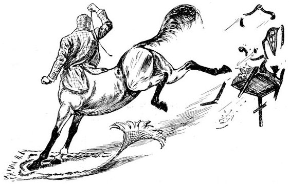 At this moment the sailor woke and rose to see what was going on. Now, gentleman and man of honour as Mr. Hay was down to the waist, the instinct of battle and self-preservation in his equine portion instantly gained the ascendency in those moments when action was called for; and it was with feelings of the most unfeigned horror and regret that he felt himself backing toward the unhappy sailor and taking up a favourable position for an effective kick.