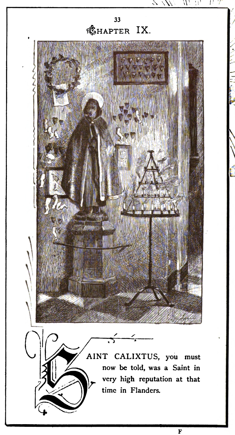 ‘Well, if you won’t be obliging and cook my goose,’ says Johnny Nut, ‘why, I’ll give it to Saint Calixtus. A pretty poor saint he’ll be if he does not give me a goose fit to put on the spit in exchange for my goose of gold!’