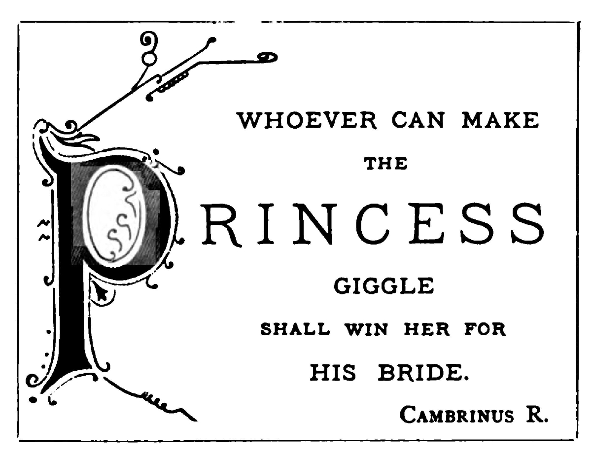 Now when the Princess beheld our Johnny, and the landlord’s three daughters, and the fat Vicar, and the thin Beadle, and the two Curates, and the Organist, the violin-player, the man with the comet, and all the wicked little choir-boys, all stuck fast together, and all treading on each other’s heels, she fell into such convulsions of laughter that she dropped into the Queen’s arms, and chuckled till she was nearly dead.