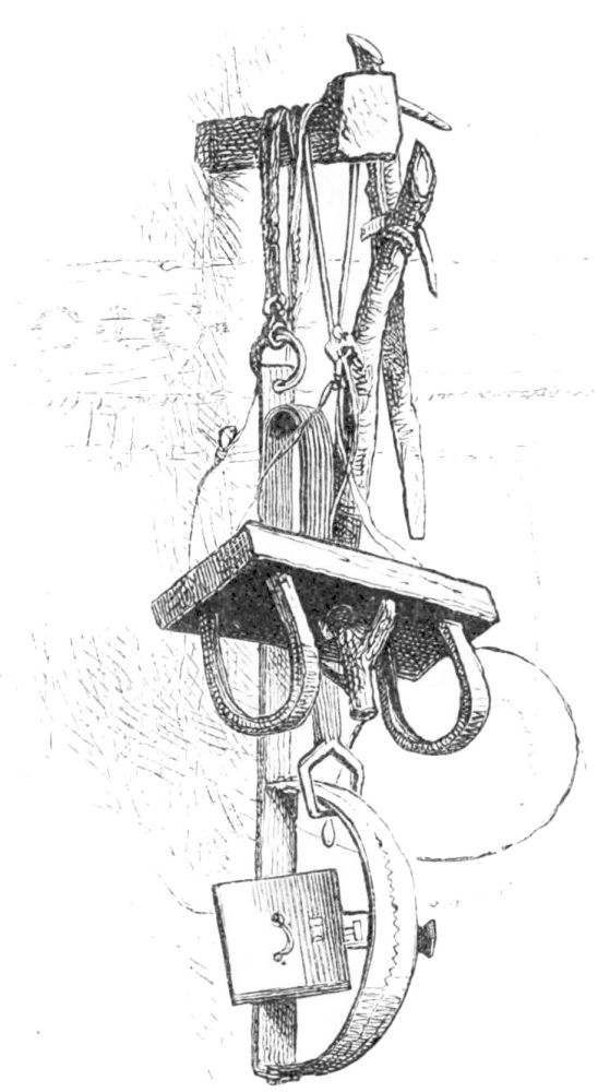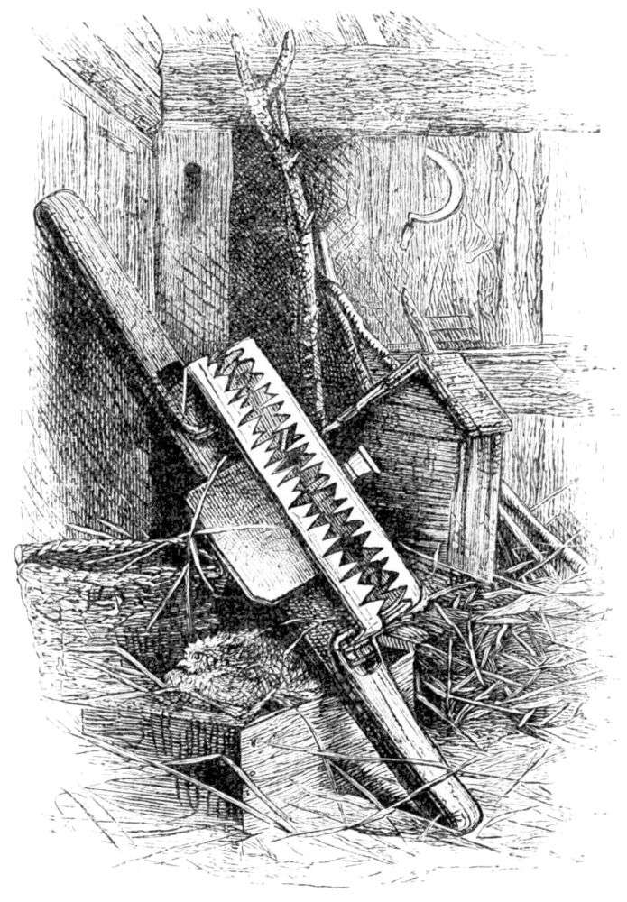 In a dark corner there lies a singular-looking piece of mechanism, a relic of the olden times, which, when dragged into the light, turns out to be a man-trap. These terrible engines have long since been disused—being illegal, like spring-guns—and the rust has gathered thickly on the metal. But, old though it be, it still acts perfectly, and can be ‘set’ as well now as when in bygone days poachers and thieves used to prod the ground and the long grass, before they stepped among it, with a stick, for fear of mutilation.