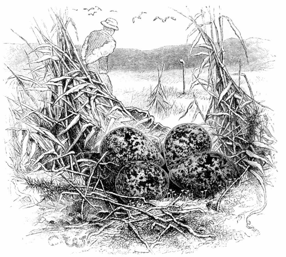 Plovers’ eggs, again, are an article of commerce in the spring; they are protected now by law, but it is to be feared that the enactment is to a great extent a dead letter. The eggs of the peewit, or lapwing, as the bird is variously called, are sought for with great perseverance, and accounted delicacies. These birds frequent commons{164} where the grass is very rough, and interspersed with bunches of rushes, marshy places, and meadows liable to be flooded in the winter. The nest on the ground is often made in the depression left by a horse’s hoof in the soft earth—any slight hole, in fact; and it is so concealed, or rather differs so little from the appearance of the general sward around, as to be easily passed unnoticed. You may actually step on it, and so smash the eggs, before you see it.