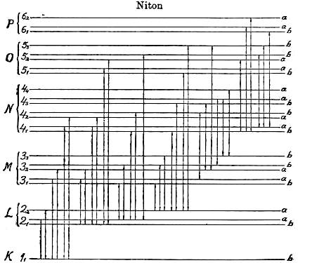 It may be of interest to insert here a few words about a new paper of Coster which appeared after this address was given, and in which he has succeeded in obtaining an extended and detailed connection between the X-ray spectra and the ideas of atomic structure given in this essay. The classification mentioned above was based on measurements of the spectra of the heaviest elements, and the results in their complete form, which were principally due to independent work of Coster and Wentzel, may be represented by the diagram in Fig. 5, which refers to elements in the neighbourhood of niton.