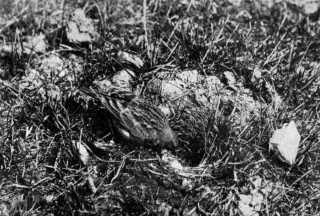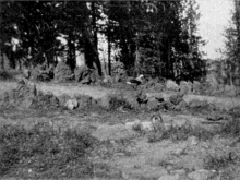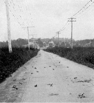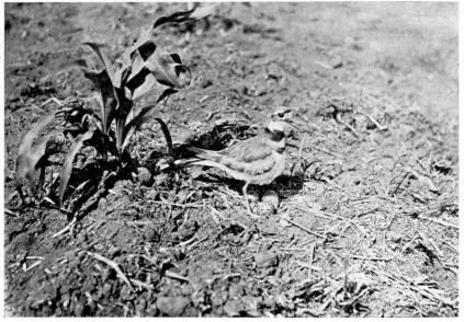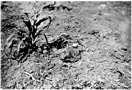 By throwing oats on only one spot, and that close to the window, I soon gathered quite a flock of Horned Larks, who came regularly every morning to feed from the constantly replenished supply. Finally, after a week of gloomy, dark weather, a cloudless sky offered especially good chances for a photograph of my feathered friends. This time I placed the camera on the window-sill. Maneuvers attendant upon focusing and inserting a plate-holder, of course, - 16 - frightened the birds away. They were back again within a few minutes, but an unexpected source of annoyance interfered. A freight train stopped opposite the scene of my operations and belched great billows of smoke between the sun and the birds. Also the shadow of the cabin was gradually encroaching on the feeding ground. I made a trial exposure, however, and obtained a very good negative. But a shadow in the foreground and a wagon tongue in the rear, did not add to the pictorial effect of the group.