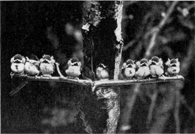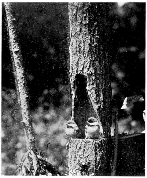 Having concluded from all indications, chief among which was the immense number of huge caterpillars carried in to the young, - 13 - that the latter must be fairly grown, we decided to expose the nest and complete our collection by securing the entire family. So carefully sawing away the front wall of the cavity with a keyhole saw carried for just such purposes, we gave the little fellows within their first view of the outside world. I fear they must have thought the manner of opening their second shell a rather rude one, and the outlook somewhat forbidding. They were pretty little youngsters, fully grown, with clean, jaunty coats, and a grown-up 'chickadee-dee,' just like the old folks. Though somewhat dazzled at first by the sudden flood of bright sunlight, they were, after a little coaxing, induced to sit out on the veranda that had been improvised for them; but, like youthful sitters generally, they were hard to pose, and after many exposures, we succeeded in getting no more than two of them at once. The prettiest one of all, showing two of the little fellows as they finally settled down contentedly in the warm sunshine, was obtained at the expense of much patient effort and a great deal of slushing back and forth in mud and water between boat and camera, and it was gratifying to find that one at least of the negatives did fair justice to the situation.