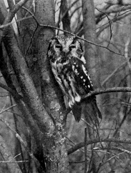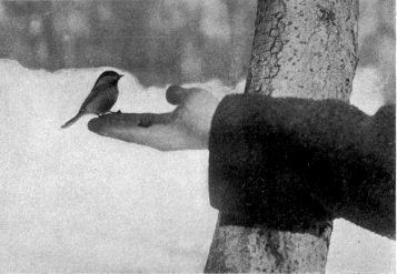 Leaving general considerations, let us first study a series of photographs that well illustrates what charming and dainty little pictures can sometimes be secured with most trifling effort. Success in this instance was easily attained because the little 'sitters' were not very unwilling and because the conditions under which they lived were more than usually favorable. The subject of these photographs, the little Black-capped Chickadee, or Titmouse,—Parus atricapillus, the scientists call him,—is familiarly known to almost every one who has given even casual attention to birds. Its generally common occurrence throughout the United States, cheery, happy disposition, and lively notes as the little band, for they usually travel in companies, goes roaming through woodland and - 10 - copse, endears it to all. All through the long, dreary winter, with its short days and perpetual snow and ice, they are the same sprightly, contented little fellows, and refreshing it is to meet and visit with them at such times as they come 'chick-a-de-dee'-ing right into your very presence in their familiar, confiding way. Springtime finds them with a mellow, long-drawn love whistle of two notes and thoughts of home and home-like things. Soon, down by the lake or brook-side, or in some moist woodland glade, where birch and willow trunks long since dead and soft with age stand sheltered among the growing trees, the little Black-cap and his chosen mate pick out a cozy retreat. This, perhaps, is some deserted Woodpecker den, decayed knothole, or more often it is a burrow of their own making, and here they assume the delights and cares of wedded life. A snug, warm nest of rabbit's hair or fern down is quickly built, and in this softest of beds the five or six rosy white, finely speckled little eggs are laid. Before very many days, eight or ten at most, the old stump exhibits unmistakable signs of being animated within, and in a wonderfully short time the little nestlings are as large as their parents, and full, indeed, is this family domicile. Owing to the cleanly habits and care of the old birds, the dresses of the youngsters are cleaner and brighter than those of their hard-worked, food-carrying parents. It was just at this stage in their progress that the little family, whose portraits are here shown, was discovered one late June day, snugly ensconced within the crumbling trunk of a long since departed willow tree. With a bird-loving companion, Mr. Leslie O. Dart, the writer was drifting idly in a little boat through one of the many channels of the Mississippi river, which cut up into innumerable islands, the heavily wooded bottomland of eastern Houston county, Minnesota. Being in search of the nests of numerous Prothonotary Warblers, which were flashing hither and thither across the channel, we skirted the shore closely, tapping on all likely-looking stubs. - 11 - Now the tapping brought to view a Downy Woodpecker, then a beautiful Golden Swamp Warbler; sometimes unexpectedly a great gray mouse scrambled out and plunged boldly into the water beneath; but this time the blow was followed by a subdued hum from within, and an inquiring, anxious parent Chickadee appeared suddenly on the scene, joined in a moment by a second, and we had the family complete. It was near noon, the sun was shining brightly, the hole was on the water side of the stub in the light, and we had no Chickadee pictures; so we camped at once and prepared to 'do' the situation. A little investigation showed the nest to be too high for setting up the camera satisfactorily, as the tripod legs sank deep in the mud and water. But our kit included a saw for just such an emergency, and sawing off the soft stub at the proper height, it was lowered gently until the hole came just on a level with the camera, placed horizontally and at a distance of about three feet. Propped with a forked stick, it rested quite securely on the soft bottom. This was better than tipping the camera and employing the 'swing back,' as the sun was nearly overhead. After focusing carefully on the opening in the stub, attaching to the camera fifty feet of small rubber tubing with large bulb, in place of the usual short tube and small bulb, setting carefully the trigger and other accessories of our harmless gun, and covering the whole camera with a hood of rough green cloth, the lens alone visible, we retreated to a convenient vantage point among the small willows close by. But a few minutes elapsed before the old birds were on the spot peering at us and the big green object from all sides. In an incredibly short space of time, considering the great liberties that had been taken with their habitation and door yard, they became resigned, and one of the birds, which we assumed to be the female, flew straight to the stub, and, with a last suspicious glance at the great glistening eye so near at hand, disappeared into the hole with a large brown worm in her bill. But that momentary delay was the looked-for opportunity, and all-sufficient; for with a quick squeeze of the bulb, click went the shutter, and in the twenty-fifth of a second the bird was ours; shot without so much as knowing it, without indeed the ruffling of a feather or the drawing of a drop of blood, and preserved life-like and true to nature for all time to come.