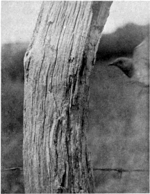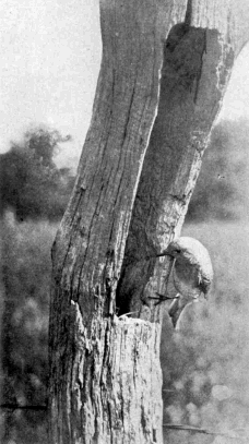 From this time on the birds came and went without hesitation, the only serious delays in our operations being due to the drifting clouds, which now and then obscured the sun and rendered the light too weak for the rapid exposures necessary. One of the birds, the one we took to be the female, was a little more courageous - 12 - than the other, and it is her picture that appears oftenest. The timid one,—the male,—even went so far on several occasions as to himself devour the worm he had brought rather than trust himself at close quarters with the unknown enemy, although his mate was at the time coming and going industriously and keeping the little folk well supplied with the great larvæ. Surely personal traits and individuality are quite as well marked in the bird world as higher in the scale! After we had made several more exposures similar to the first, one of the best of which shows the bird, worm-laden as before, balanced on the edge of the hole and taking the usual last look at the camera, we turned our attention to catching her as she was coming out. This required quicker coöperation between eye and hand, as the exit was generally made with a dash; but the accompanying picture, with head just emerging, will show that we were fairly successful.