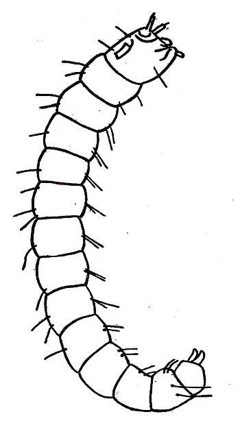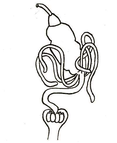 Fig. 1. The larva of a flea. The body consists of thirteen segments and is legless. On the fore part of the head are the antennæ and on the upper part of the head is shown the knife-like edge of the egg-breaker. The mouth-parts are adapted for biting. On the last segment of the body are the two caudal stylets.