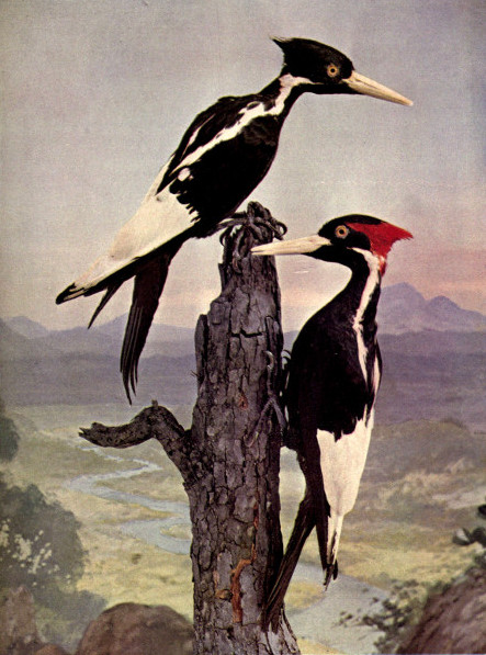 The Ivory-billed Woodpecker, living his almost solitary life in the vast and nearly impenetrable cypress swamps, at a height of forty and fifty feet from the ground, is rarely seen by man. The specimens we present in Birds are so nearly life-like that our readers need only imagine themselves in the dense forest of cypress to realize a very natural scene.