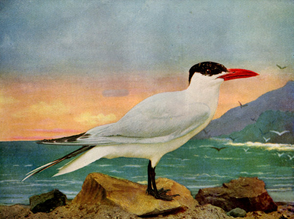 THE great Caspian Tern is the largest of the family, its wings, when extended, measuring from fifty to fifty-five inches in length. It is a bird of very irregular distribution, breeding in Labrador, along the Arctic coast, on islands in Lake Michigan, on the coasts of Virginia, Texas, and California, and is numerous in Australia. Forbes found it to be more or less common about Washoe Lake and the Humboldt Marshes, Nevada, and the Great Salt Lake, Utah, where it was no doubt breeding. He says that unlike most other Terns, particularly unlike the almost equally large Royal Tern, the Caspian appears to breed in isolated pairs instead of large colonies, its nest being found far removed from that of any other bird, and consisting merely of a shallow depression scooped in the sand, in which its two eggs are laid, with little if any lining, though a few grass or sedge blades or other vegetable substance are sometimes added. It is very bold in defense of its eggs or young, darting impetuously at the intruder, uttering meanwhile hoarse barking or snarling cries.