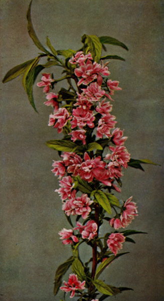 THE Sweet, the Bitter, and the Flowering Almond are all of a kin and in this kinship many include also the Peach and the Nectarine. The Flowering Almond or the dwarf Almond is a shrub which early in the spring, in March or April, sends forth its fair rosy blossoms before its leaves are sprouted. The shrub seldom exceeds three feet in height. The leaves are like those of the willow, only darker and of a more shining green. It is really a native of Calmuck Tartary but now is used extensively in gardens because it blooms so early and can easily be cultivated in any dry soil.