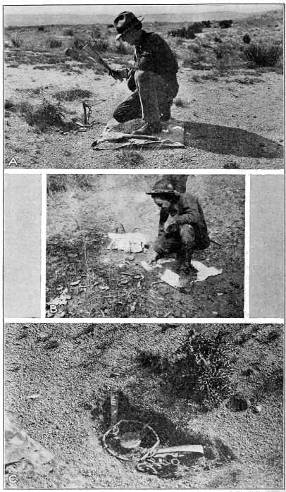 In placing the trap pad over the pan and onto the shoulders of the dirt built up for carrying it, the utmost care must be taken to see that no rock, pebble, or dirt slips under the pan, which would prevent the trap from springing. With the trap pad in place (fig. 2, A), the entire trap is carefully covered with the remaining portion of earth on the setting cloth (fig. 3, B).