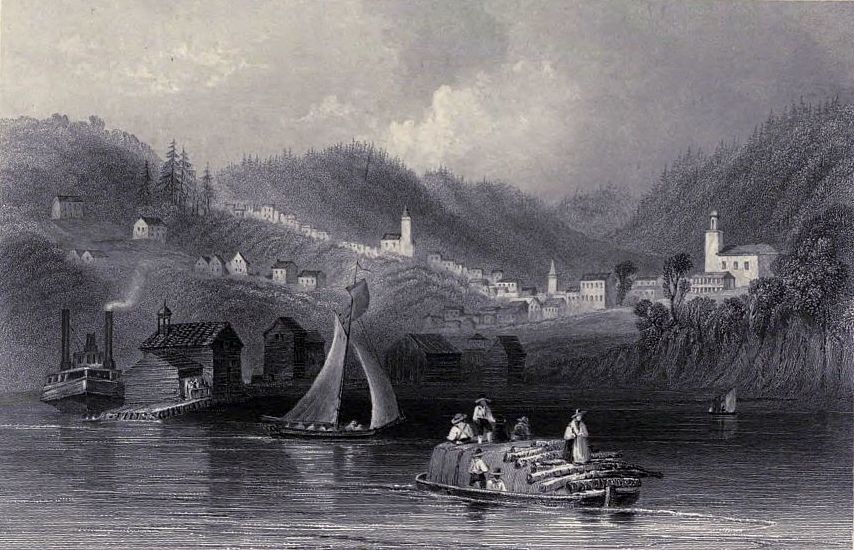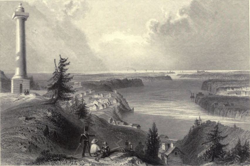 About two miles above Quebec, a break in the magnificent line of cliffs forms the little recess, called Wolfe’s Cove; a steep pathway leads up the heights to the Plains of Abraham; traces of field-works are still visible on the turf, and the stone is pointed out on which the hero expired. The cove is at present appropriated to the reception of lumber, which comes down the river from the States and Upper Province, in rafts, which frequently cover the surface of half an acre; when the wind is favourable they spread ten or twelve square sails, at other times they are polled down; the men who navigate them build small wooden houses on them, and thus, transported with their families, poultry, and frequently cattle, form a complete floating village. A great proportion of the timber is brought from Lake Champlain, and the trade is almost wholly in the hands of the Americans.
