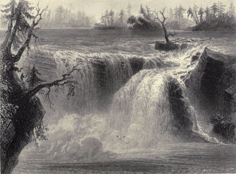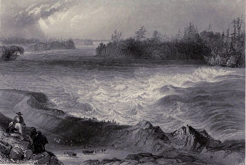 “At Ogdensburgh, which is said to belong principally to Mr. Parish, who is endeavouring to settle a tract of land in the vicinity, we breakfasted at a large stone tavern, which he has built, and then prepared in high spirits to descend the Rapids. For this purpose we hired a long boat, which would accommodate the whole party, and which, with 25 people on board and their baggage, and 25 barrels of flour for ballast, was said to draw only eight inches of water. We set sail about ten o’clock, and in four hours and a few minutes had been carried 48 miles down the stream, in the course of which we had passed the first three rapids, one of which was half a mile, another two, and another about nine miles long. We always discerned them at a great distance, the dashing of the white foam resembling the tossing of the ocean; and as we approached them our velocity gradually increased, till we were carried by the stream at the rate of 14 or 15 miles an hour. When we got into the middle of the surges, our velocity, though still great, was checked by the eddies and by waves which frequently struck the bottom of the boat with great force; and from the appearance of the troubled waters, it seemed difficult for a boat to live. The confidence of the boatmen, however, checked our apprehensions, and our ladies behaved extremely well. The most alarming appearance was that of pointed rocks, which, from the transparency of the water, seemed to rise almost to the surface, and to threaten inevitable destruction. As I stood on the bow, I saw combinations of rocks, towards which we were hurried with impetuosity, and which it seemed impossible our boat could pass without striking. In some of the Rapids there were channels, called lost channels, from the accidents which had happened in them, and into which our boatmen had to guard against our being carried. The river varies from three-fourths of a mile to two miles in width; and although there are no mountains near, (the green mountains of Vermont were often in sight at a distance,) the white pine and cedar gave a picturesque appearance to its banks, and a resemblance to the river views in Norway or Sweden. One of the most singular sensations we experienced, was that of sailing many miles perceptibly down hill. Soon after passing the third rapid, the St. Lawrence expanded into a wide lake—the Lake of St. Francis. There we lost our wind and stream, and were obliged to have recourse to our oars. The evening was now closing in, and a violent thunder-storm brought on a premature darkness; but the ladies enlivened us by singing the Canadian Boat-Song, ‘Row, brothers, row, &c.’ which transported me to ——, where I have so often heard it.