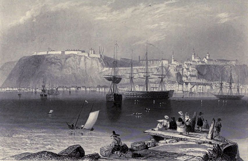 “The town, or rather city, of Quebec, is built on the northern extremity of a narrow strip of high land, which follows the course of the St. Lawrence, for several miles, to its confluence with the Charles. The basis of this height is a dark slate rock, of which most of the buildings in the town are constructed. Cape Diamond terminates the promontory, with a bold precipice towards the St. Lawrence, to which it is nearly perpendicular, at the height of 320 feet. It derives its name from the crystals of quartz found in it, which are so abundant, that, after a shower, the ground glitters with them. The lower town is built round the foot of these heights, without the fortifications, which, with the upper town, occupy their crest in bleak preeminence: the former, snug and dirty, is the abode of thriving commerce, and of most of the lower classes employed about the navy; the latter, cold and lofty, is the seat of government, and principal residence of the military; and claims, in consequence, that kind of superiority which some heads have been said to assert over the inglorious belly. To speak the truth, neither has much to boast on the score either of beauty or convenience.
