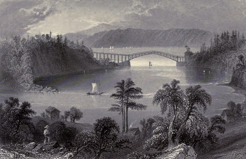 “Soon after I had finished my letter on board the steam-boat, we stopped near the mouth of the Genessee river, to give us the opportunity of seeing Rochester and its vicinity. Stages had been previously sent for, in which we proceeded to Rochester, nine miles distant. On our way we stopped to see the lower falls of the Genessee river, and Carthage bridge. This wooden bridge is now in ruins. When perfect, it must have been extremely beautiful. It was a single arch, whose span was about 350 feet wide, and its extreme height above the surface of the river 196 feet. It gave way from the slightness of its materials, immediately after two children had crossed it. A short distance above it are the falls of the Genessee, which appeared to me to bear a strong resemblance to those of the Clyde. At Rochester we found a handsome mill, and every symptom of a thriving town. Instead of ‘cash store’ being painted over the shops, as in most towns of the United States, to tell the customers that the shopkeepers sell only for cash, while they may almost be induced to sell even a thimble on credit; ‘here cash given for wheat,’ ‘cash given for, &c. &c.’ was the usual motto. We learnt also, that the town was blessed by the absence of a bank, while in the smallest American town I had been accustomed to find banks the first objects which presented themselves—the Farmer’s Bank, the Merchant’s Bank, the Planter’s Bank, the Mechanic’s Bank, the Franklin Bank, the Patriotic Bank, &c. &c. with their various combinations, had met my eye more or less in every village. We embarked again about two o’clock, and in the morning by day-light found ourselves at Sacket’s Harbour, of which we heard so much during the war. It is a noble natural harbour, and the place where the American ships employed on the lakes were built so rapidly. Many of them are now rotting under wooden covers. There is one half finished, said to be longer than our largest ship of the line, covered with a wooden shade, which itself, our conductor told us, cost 7,000l. This immense vessel, so far inland, on the banks of a lake, was a singular sight, and excited some incongruous ideas.
