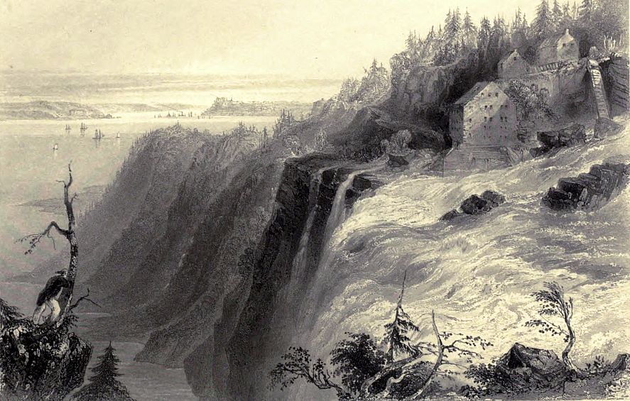 “In the course of our ride we were often reminded of home by the rich little meadows and thickly settled country on every side. The distant mountains were very fine. We reached our inn at nine o’clock, having accomplished, after six o’clock the preceding night, what usually occupies two days. After breakfast I devoted myself to business; and, declining an invitation from Judge —— to accompany him to the ‘military mess’ to dinner, I set off to the Falls of the Chaudière, seven miles distant, intending to drink tea on our return with a gentleman who lives on the way. It was so dark, however, when we reached his house, five or six miles from Quebec, and had begun to rain so heavily, that we thankfully accepted his offer of a bed. The Falls of the Chaudière were highly interesting, even after Niagara. In the deep seclusion of a thick wood, the river, nearly 250 yards wide, precipitates itself a hundred feet into a rocky channel, which appears to have been rent asunder by some dreadful convulsion of nature, by which the rock has been broken into huge masses, that combine with the surrounding objects to impart an air of most magnificent wildness to this extraordinary scene. On our return we had several fine views of Quebec down the river.
