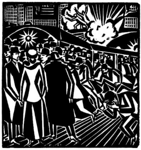 Bei der nächsten Station kam wilde Bewegung ins Gedränge. Schreiende Leute stürzten in den schon überfüllten Wagen. Peter verspürte den Anprall und tragenden Druck der Menschenwelle. Über dem Tunnel, oben über der großen Stadt, ein dumpfes Krachen. Der Zug fuhr weiter. In diesem Augenblicke rannte in wahnsinniger Angst ein Mensch die Treppe hinunter, indem er die Hände vors Gesicht hielt und — jetzt kollerte er ganz hinunter. Man sah gerade noch, wie ihm Blut zwischen den Fingern floß . . . Dann kam wieder der finstre Tunnel. Im Waggon Schreckensrufe: die Flieger sind da! . . . In der gemeinsamen Gefahr, darin diese gepferchten Leiber zu einem Körper verschmolzen, hatte Peters Hand die Hand ergriffen, die er dicht neben der seinen fühlte. Und wie er die Augen hob, da war es Sie.