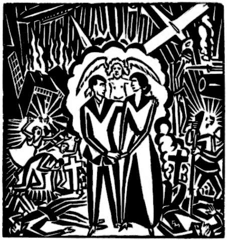Im selben Augenblick bewegte sich der plumpe Pfeiler, an dem sie lehnten; die ganze Kirche zitterte in ihren Grundfesten. Lutzens Herz schlug so laut, daß sie weder den Krach der Explosion, noch das Schreien der Menge hörte; es blieb ihr keine Zeit, Schreck oder Schmerz zu empfinden — so schnell warf sie sich, wie eine Henne vor die Küchlein, schützend über Peter; geschlossenen Auges lächelte der vor Glück. Wie eine Mutter drückte sie mit aller Kraft das teure Haupt an ihren Busen; sie war über ihn gebückt, ihr Mund auf seinem Nacken — so duckten sie sich zusammen.