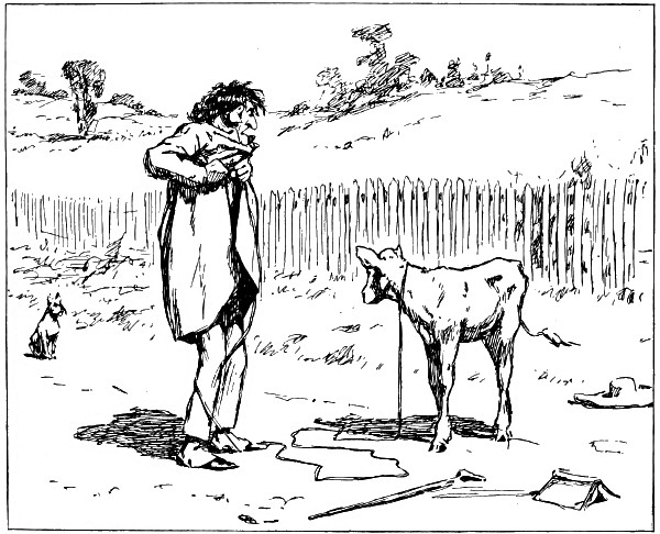 "Be still, little calfy, till I untie this cord–that's a good little calfy," says the Humane Man.