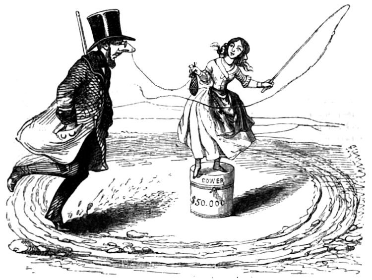 The manner in which this authority is exercised differs according to circumstances. Some of the unfortunate fair ones who have lost their mates have attractions in the shape of weighty dower. Men of a certain age have keen noses for such charms; and when the widow suspects it, she often leads her importunate admirer by that organ, and by a dexterous management of the mystery of courtship, which is called “getting a bean on a string.” Once the gentleman is secured by that means, the widow takes into her hand the whip of management, and compels the poor beau to trot a weary round in an arena which extends its charmed circle about her.