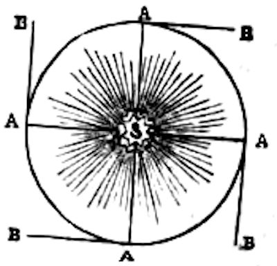 Suppose the straight lines A B, to represent the direction in which the earth would travel under the influence of the projectile force, which launched it into universal space: the straight lines A S, are those it would describe at any point of its orbit, if surrendered to the influence of the sun’s attraction. The primitive impulse is, however, checked by the solar attraction, and the latter by the former; so, that while the earth—if abandoned to either—would describe A B, or A S, the effect of their joint influence incessantly acting is to deflect it from both, and produce a curved path. The cause perpetually operating, the effect is constant—and hence the formation of the terrestrial orbit; and the cause extending to the other bodies in the system, the planetary orbs are deflected from their natural rectilinear paths, and pursue a circuit round the common centre. The force of attraction is, however, proportional to the quantity of matter, and the proximity of the attracting body. Like light, the power of gravitation is weakened by diffusion, and diminishes as the square of the distance increases. This square is the product of a number multiplied by itself. A planet, therefore, twice our distance from the sun, will gravitate four times less than we do—the product of two multiplied by itself being four. Such is the great Law of Gravity, subject to the two conditions, that its force is directly as the mass of the bodies, and inversely as the square of the distance. It extends to the confines of the system, and acts as a mighty invisible chain to keep the primary bodies in brotherly relationship to each other, and in mutual subjection to the central luminary. And who can trace its operation without recognizing a Supreme Potentate, who appointed to the sun his place, launched the planets in the depths, obedient to a law which has preserved the family compact—originally established—unbroken through the long series of ages.